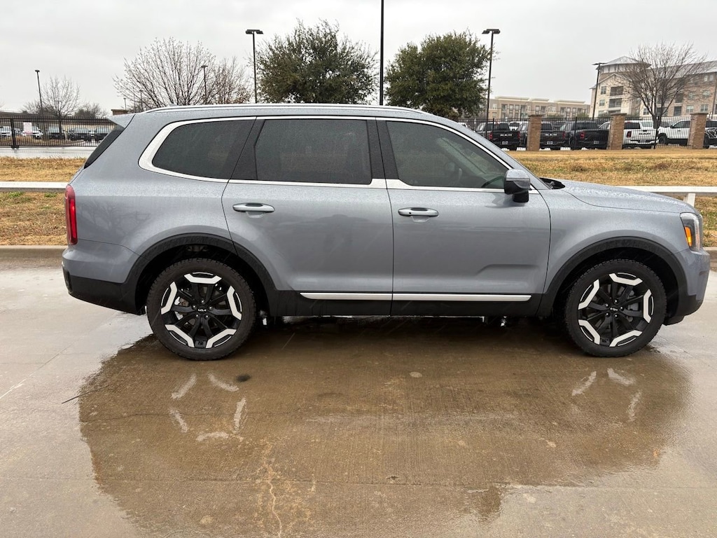 The 2024 Kia Telluride S in Everlasting Silver is a sophisticated choice for those who value both style and substance in their SUV. With its robust 3.8L V6 engine and seamless 8-speed automatic transmission, this used Telluride offers a smooth and powerful driving experience, perfect for both city commutes and weekend getaways. Safety is paramount, featuring advanced systems like Blind Spot Monitor, Lane Keeping Assist, and Rear Collision Mitigation, ensuring peace of mind on every journey. The interior is a haven of comfort with heated front seats, a power driver seat, and premium synthetic upholstery, making long drives a pleasure. The third-row seating ensures ample space for family and friends, while the rear bucket seats and adjustable lumbar support enhance passenger comfort. Tech-savvy drivers will appreciate the integrated navigation system, Bluetooth connectivity, and smart device integration, keeping you connected and entertained. The adaptive cruise control and rear parking aid add convenience to your drive, while the sleek aluminum wheels and rear spoiler add a touch of elegance. The 2024 Kia Telluride S is the ideal companion for those who seek adventure without compromising on luxury and safety.